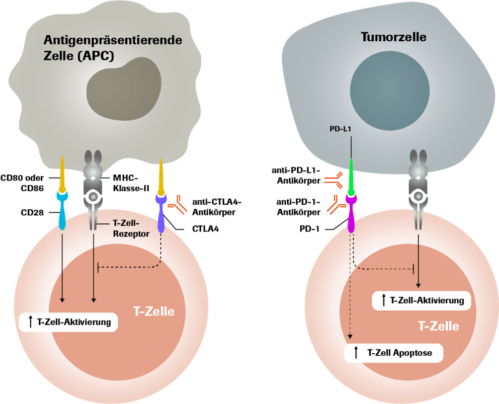 Tumorzellen weisen im Vergleich zu gesunden Zellen Veränderungen in ihrer DNA auf. Damit sind auch die kodierten Proteine in ihrer Struktur verändert. Präsentieren die Tumorzellen nun, wie jede menschliche Zelle, Peptide von sich (Tumor-Antigene) über das MHC-Molekül, werden sie von den T-Zellen durch die Bindung des T-Zell-Rezeptors (TCR) als fremd erkannt und die malignen Zellen bekämpft. Um das Immunsystem jedoch grundsätzlich in Balance zu halten, wird auf verschiedenen Ebenen die Aktivität von T-Zellen reguliert, um eine überschießende Immunreaktion zu vermeiden. Dazu exprimieren T-Zellen inhibitorische Moleküle wie PD-1 und CTLA-4. Binden sie an ihre zugehörigen Interaktionspartner PD-L1 oder CD80/CD86, wird die Immunantwort inhibiert (Abbildung 1).