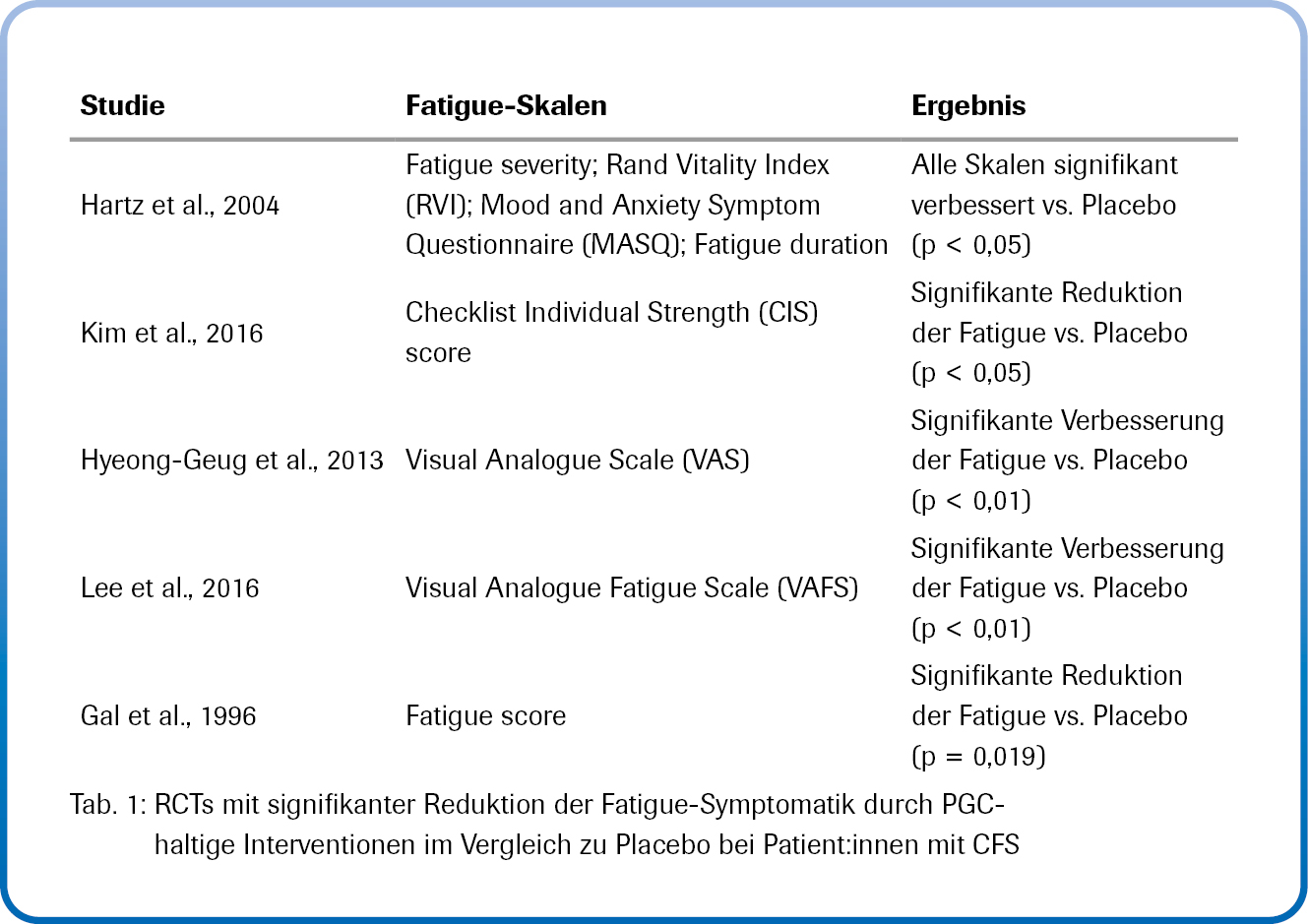 Fünf eingeschlossene RCT-Studien beschreiben die Behandlung von Patient:innen mit CFS. Sie erfassten den therapeutischen Effekt von PGC-haltigen Interventionen anhand unterschiedlicher Fatigue-Skalen. Alle Studien