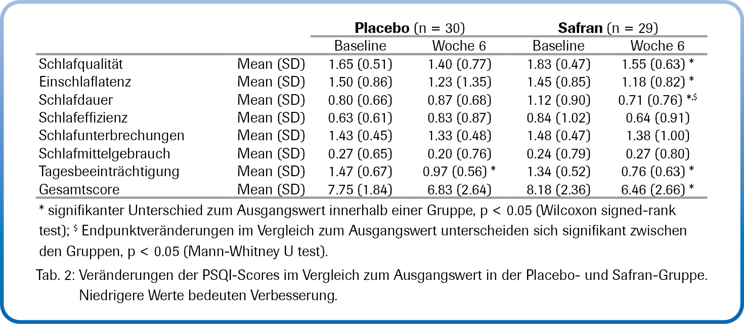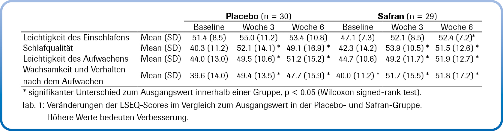 In der Safran-Gruppe führten sechs Wochen Supplementierung mit Safran-Extrakt zu einer signifikanten Verbesserung folgender Schlafparameter gegenüber dem Ausgangswert: Im Bett verbrachte Zeit (Time In Bed TIB), beurteilt mittels Aktigraphie; Einschlaflatenz, Schlafqualität, Erwachen sowie Wachheit und Verhalten nach dem Wachsein, bewertet mittels LSEQ-Fragebogen [Vgl. Tab. 1]; Schlafqualität, Schlaflatenz, Schlafdauer, Funktionsstörungen tagsüber sowie Globaler Score, bewertet mittels PSQI-Fragebogen [Vgl. Tab. 2]. Darüber hinaus zeigten sich in der Safran-Gruppe signifikante Verbesserungen des körperlichen Schmerzwertes,