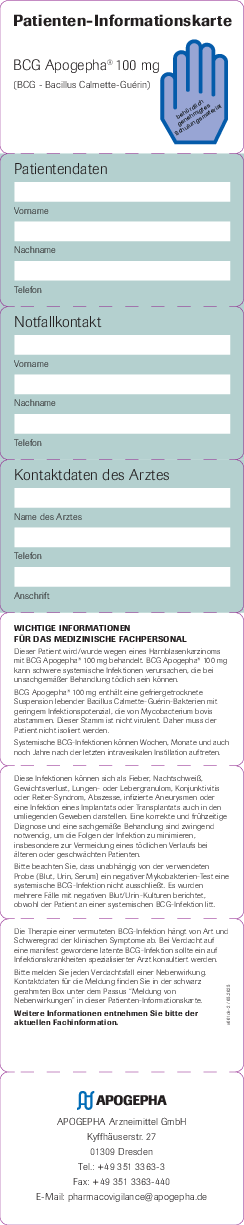 Dosierung, Art und Dauer der Anwendung: BCG Apogepha® 100 mg darf nur von Ärzten verabreicht werden, die Erfahrung mit dieser Behandlung haben. Das BCG-Behandlungsschema besteht aus einer sechswöchigen Induktionstherapie und einer ein- bis dreijährigen Erhaltungstherapie. Die exakte Dauer kann sich unterscheiden und ist individuell abzuwägen.